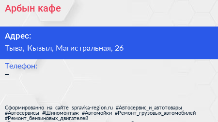 Арбын, кафе по адресу Тыва, Кызыл, Магистральная, 26 в дальнейшем Организация, размещена в следующих категориях: