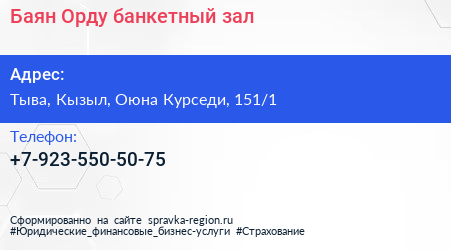 Баян Орду, банкетный зал по адресу Тыва, Кызыл, Оюна Курседи, 151/1 в дальнейшем Организация, размещена в следующих категориях: