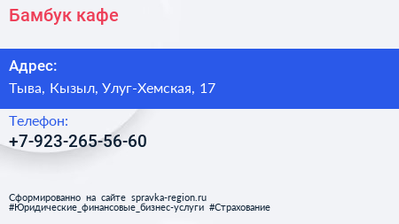 Бамбук, кафе по адресу Тыва, Кызыл, Улуг-Хемская, 17 в дальнейшем Организация, размещена в следующих категориях:
