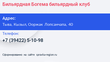Бильярдная Богема, бильярдный клуб по адресу Тыва, Кызыл, Ооржак Лопсанчапа, 40 в дальнейшем Организация, размещена в следующих категориях: