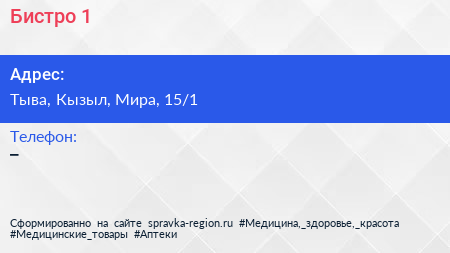 Бистро №1 по адресу Тыва, Кызыл, Мира, 15/1 в дальнейшем Организация, размещена в следующих категориях: