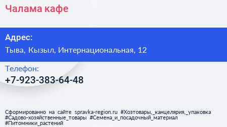 Чалама, кафе по адресу Тыва, Кызыл, Интернациональная, 12 в дальнейшем Организация, размещена в следующих категориях: