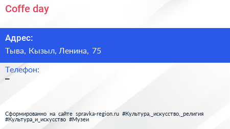 Coffe day по адресу Тыва, Кызыл, Ленина, 75 в дальнейшем Организация, размещена в следующих категориях: