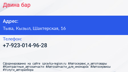 Двина, бар по адресу Тыва, Кызыл, Шахтерская, 16 в дальнейшем Организация, размещена в следующих категориях: