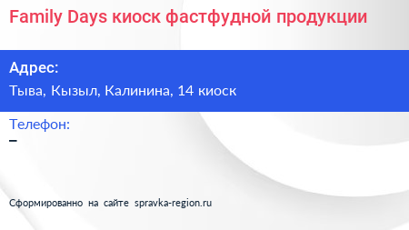 Family Days, киоск фастфудной продукции по адресу Тыва, Кызыл, Калинина, 14 киоск в дальнейшем Организация, размещена в следующих категориях:
