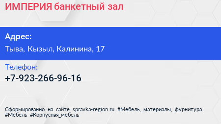 ИМПЕРИЯ, банкетный зал по адресу Тыва, Кызыл, Калинина, 17 в дальнейшем Организация, размещена в следующих категориях: