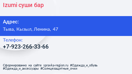 Izumi, суши-бар по адресу Тыва, Кызыл, Ленина, 47 в дальнейшем Организация, размещена в следующих категориях: