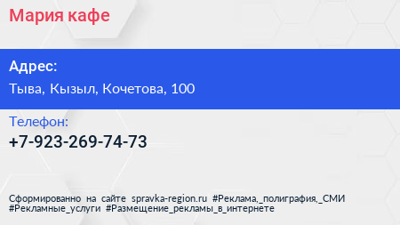 Мария, кафе по адресу Тыва, Кызыл, Кочетова, 100 в дальнейшем Организация, размещена в следующих категориях: