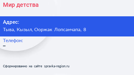 Мир детства по адресу Тыва, Кызыл, Ооржак Лопсанчапа, 8 в дальнейшем Организация, размещена в следующих категориях: