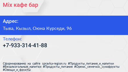 Mix, кафе-бар по адресу Тыва, Кызыл, Оюна Курседи, 96 в дальнейшем Организация, размещена в следующих категориях:
