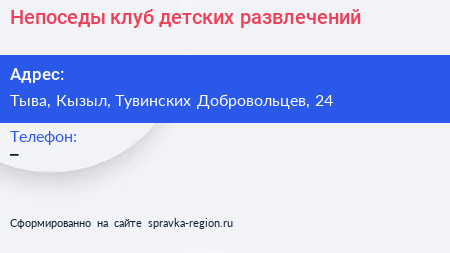 Непоседы, клуб детских развлечений по адресу Тыва, Кызыл, Тувинских Добровольцев, 24 в дальнейшем Организация, размещена в следующих категориях: