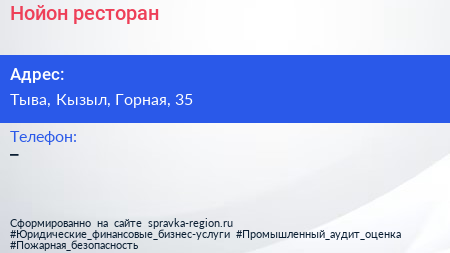 Нойон, ресторан по адресу Тыва, Кызыл, Горная, 35 в дальнейшем Организация, размещена в следующих категориях: