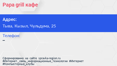 Papa grill, кафе по адресу Тыва, Кызыл, Чульдума, 25 в дальнейшем Организация, размещена в следующих категориях: