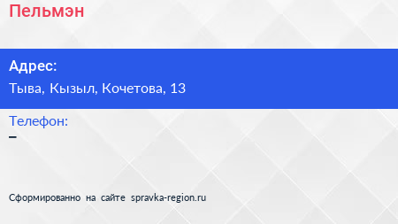 Пельмэн по адресу Тыва, Кызыл, Кочетова, 13 в дальнейшем Организация, размещена в следующих категориях: