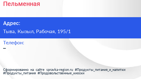 Пельменная по адресу Тыва, Кызыл, Рабочая, 195/1 в дальнейшем Организация, размещена в следующих категориях: