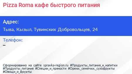 Pizza Roma, кафе быстрого питания по адресу Тыва, Кызыл, Тувинских Добровольцев, 24 в дальнейшем Организация, размещена в следующих категориях: