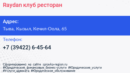 Raydan, клуб-ресторан по адресу Тыва, Кызыл, Кечил-Оола, 65 в дальнейшем Организация, размещена в следующих категориях: