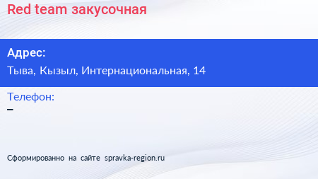 Red team, закусочная по адресу Тыва, Кызыл, Интернациональная, 14 в дальнейшем Организация, размещена в следующих категориях: