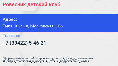 Ровесник, детский клуб по адресу Тыва, Кызыл, Московская, 106 в дальнейшем Организация, размещена в следующих категориях:
