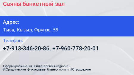 Саяны, банкетный зал по адресу Тыва, Кызыл, Фрунзе, 59 в дальнейшем Организация, размещена в следующих категориях: