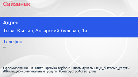 Сайзанак по адресу Тыва, Кызыл, Ангарский бульвар, 1а в дальнейшем Организация, размещена в следующих категориях: