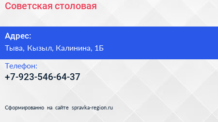 Советская, столовая по адресу Тыва, Кызыл, Калинина, 1Б в дальнейшем Организация, размещена в следующих категориях: