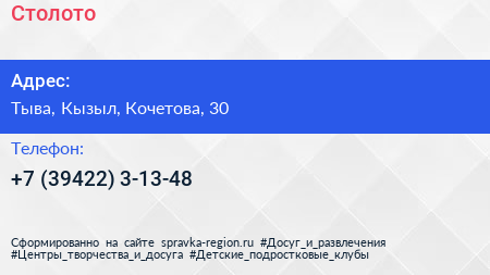 Столото по адресу Тыва, Кызыл, Кочетова, 30 в дальнейшем Организация, размещена в следующих категориях: