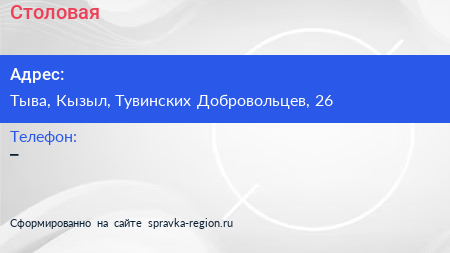 Столовая по адресу Тыва, Кызыл, Тувинских Добровольцев, 26 в дальнейшем Организация, размещена в следующих категориях: