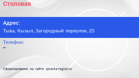 Столовая по адресу Тыва, Кызыл, Загородный переулок, 25 в дальнейшем Организация, размещена в следующих категориях: