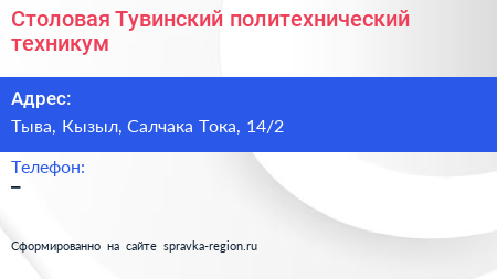 Столовая, Тувинский политехнический техникум по адресу Тыва, Кызыл, Салчака Тока, 14/2 в дальнейшем Организация, размещена в следующих категориях: