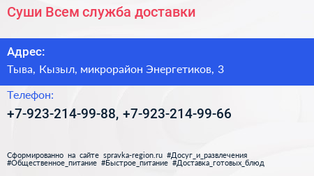 Суши Всем, служба доставки по адресу Тыва, Кызыл, микрорайон Энергетиков, 3 в дальнейшем Организация, размещена в следующих категориях: