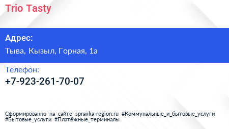 Trio-Tasty по адресу Тыва, Кызыл, Горная, 1а в дальнейшем Организация, размещена в следующих категориях: