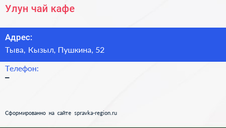 Улун-чай, кафе по адресу Тыва, Кызыл, Пушкина, 52 в дальнейшем Организация, размещена в следующих категориях: