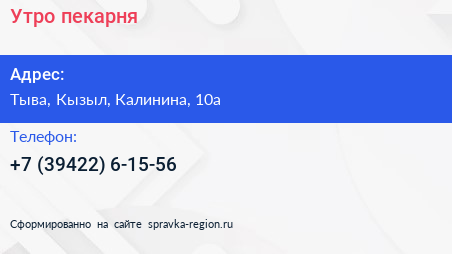 Утро, пекарня по адресу Тыва, Кызыл, Калинина, 10а в дальнейшем Организация, размещена в следующих категориях: