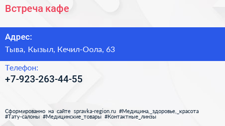 Встреча, кафе по адресу Тыва, Кызыл, Кечил-Оола, 63 в дальнейшем Организация, размещена в следующих категориях: