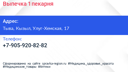 Выпечка №1, пекарня по адресу Тыва, Кызыл, Улуг-Хемская, 17 в дальнейшем Организация, размещена в следующих категориях: