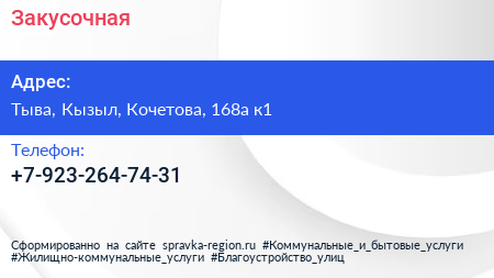 Закусочная по адресу Тыва, Кызыл, Кочетова, 168а к1 в дальнейшем Организация, размещена в следующих категориях: