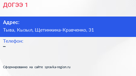ДОГЭЭ 1 по адресу Тыва, Кызыл, Щетинкина-Кравченко, 31 в дальнейшем Организация, размещена в следующих категориях: