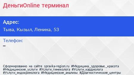 ДеньгиOnline, терминал по адресу Тыва, Кызыл, Ленина, 53 в дальнейшем Организация, размещена в следующих категориях: