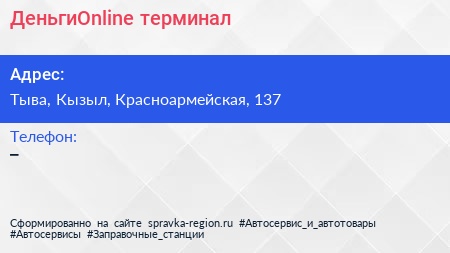 ДеньгиOnline, терминал по адресу Тыва, Кызыл, Красноармейская, 137 в дальнейшем Организация, размещена в следующих категориях: