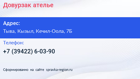 Довурзак, ателье по адресу Тыва, Кызыл, Кечил-Оола, 7Б в дальнейшем Организация, размещена в следующих категориях: