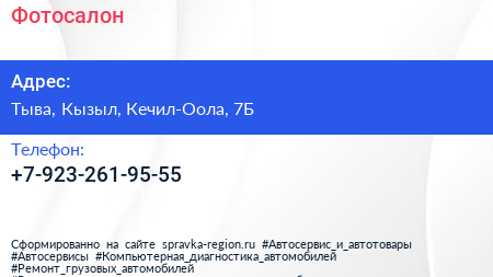 Фотосалон по адресу Тыва, Кызыл, Кечил-Оола, 7Б в дальнейшем Организация, размещена в следующих категориях: