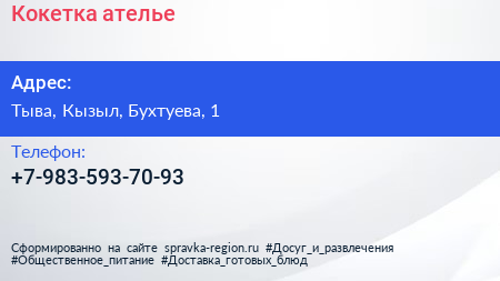 Кокетка, ателье по адресу Тыва, Кызыл, Бухтуева, 1 в дальнейшем Организация, размещена в следующих категориях: