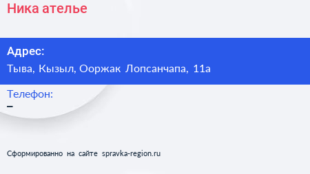 Ника, ателье по адресу Тыва, Кызыл, Ооржак Лопсанчапа, 11а в дальнейшем Организация, размещена в следующих категориях: