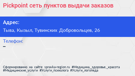 Pickpoint, сеть пунктов выдачи заказов по адресу Тыва, Кызыл, Тувинских Добровольцев, 26 в дальнейшем Организация, размещена в следующих категориях: