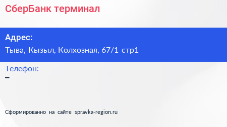 СберБанк, терминал по адресу Тыва, Кызыл, Колхозная, 67/1 стр1 в дальнейшем Организация, размещена в следующих категориях: