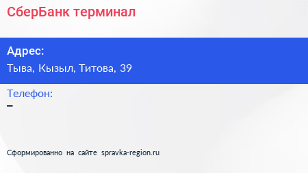 СберБанк, терминал по адресу Тыва, Кызыл, Титова, 39 в дальнейшем Организация, размещена в следующих категориях: