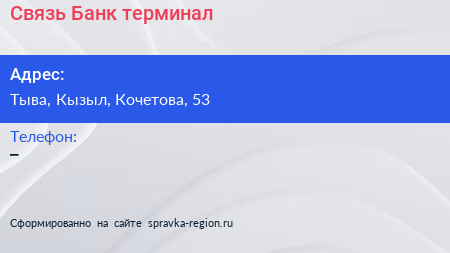 Связь-Банк, терминал по адресу Тыва, Кызыл, Кочетова, 53 в дальнейшем Организация, размещена в следующих категориях: