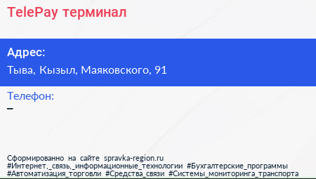 TelePay, терминал по адресу Тыва, Кызыл, Маяковского, 91 в дальнейшем Организация, размещена в следующих категориях: