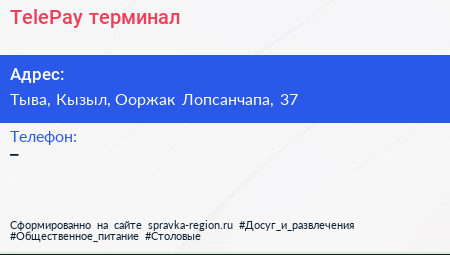 TelePay, терминал по адресу Тыва, Кызыл, Ооржак Лопсанчапа, 37 в дальнейшем Организация, размещена в следующих категориях: